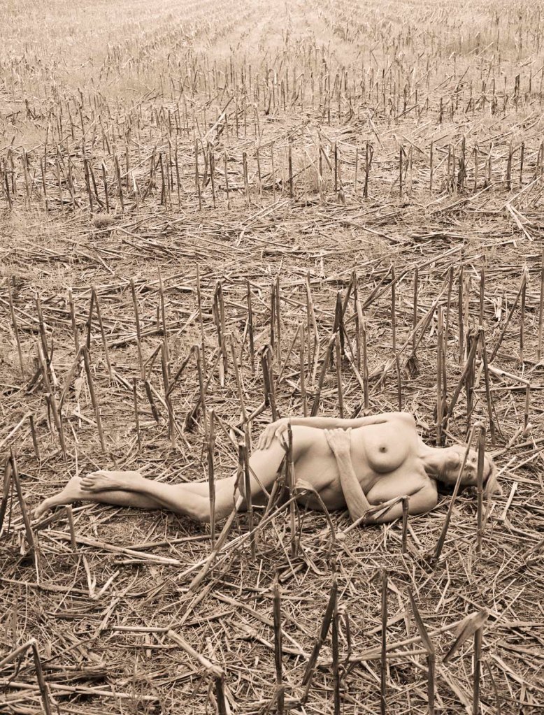 “At first glance, “Repose” appears almost apocalyptic – the nude woman, staring blankly off into the distance, her partially curled body laying in a dormant cornfield, the sepia tones of the photograph adding to the eeriness. A quick assumption could be that the figure is dead, a simple conclusion placed together by the drained color palette and lifeless cornstalks. The composition of the picture plane with it’s single point perspective makes the viewer feel as though he/she is physically in the space. The viewer is no longer only an observer, but now also a participant. It’s this play with composition that signals the viewer to take pause, and examine the photograph longer. The figure, and older woman, lays in a pose reminiscent of a relaxed fetal position — a posture associated with new life. However, everything else in this photograph recalls aging, or nearing a state of hibernation, dormancy or death. The field the figure lays in has clearly been harvested, indicating an end to the growing season and an approach toward winter. Winter is often thought of as ‘the end’ of the cycle of seasons: plants fade, animals hibernate, and humans retreat in their own ways, waiting for spring to come when life will re-emerge and be re-born. Winter brings stillness. This stillness is expressed in “Repose.” It’s the stillness that allows the viewer to reflect. While, “Repose” is clearly a photographic commentary on aging, it’s not one of hopelessness. Like the seasons, the figure has lived through seasons of her own life; and in the stillness the viewer recognizes the beauty in her age and the life that she still has left. Moreover, “Repose” causes the viewer to think about his or her own mortality and life. It works as a memento mori of sorts — but a reminder that life continues, rather than a reminder of death.”